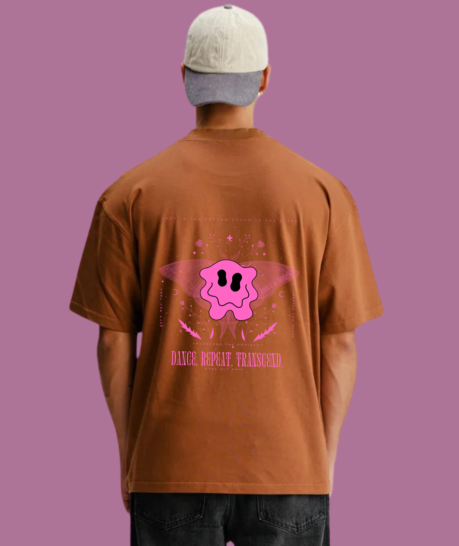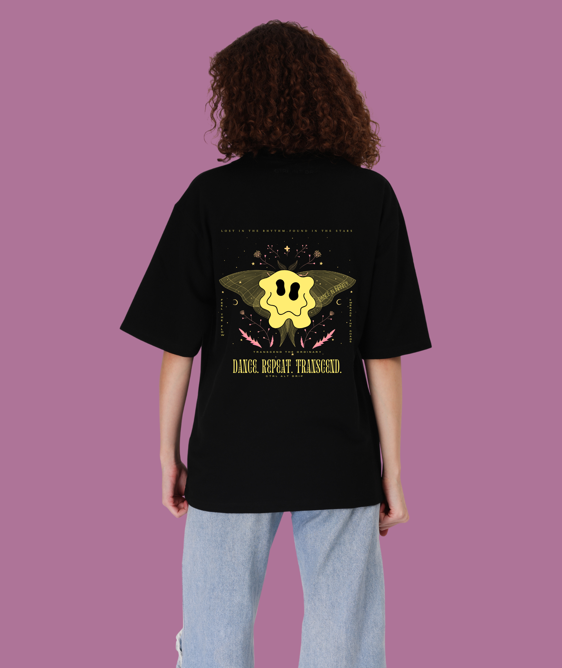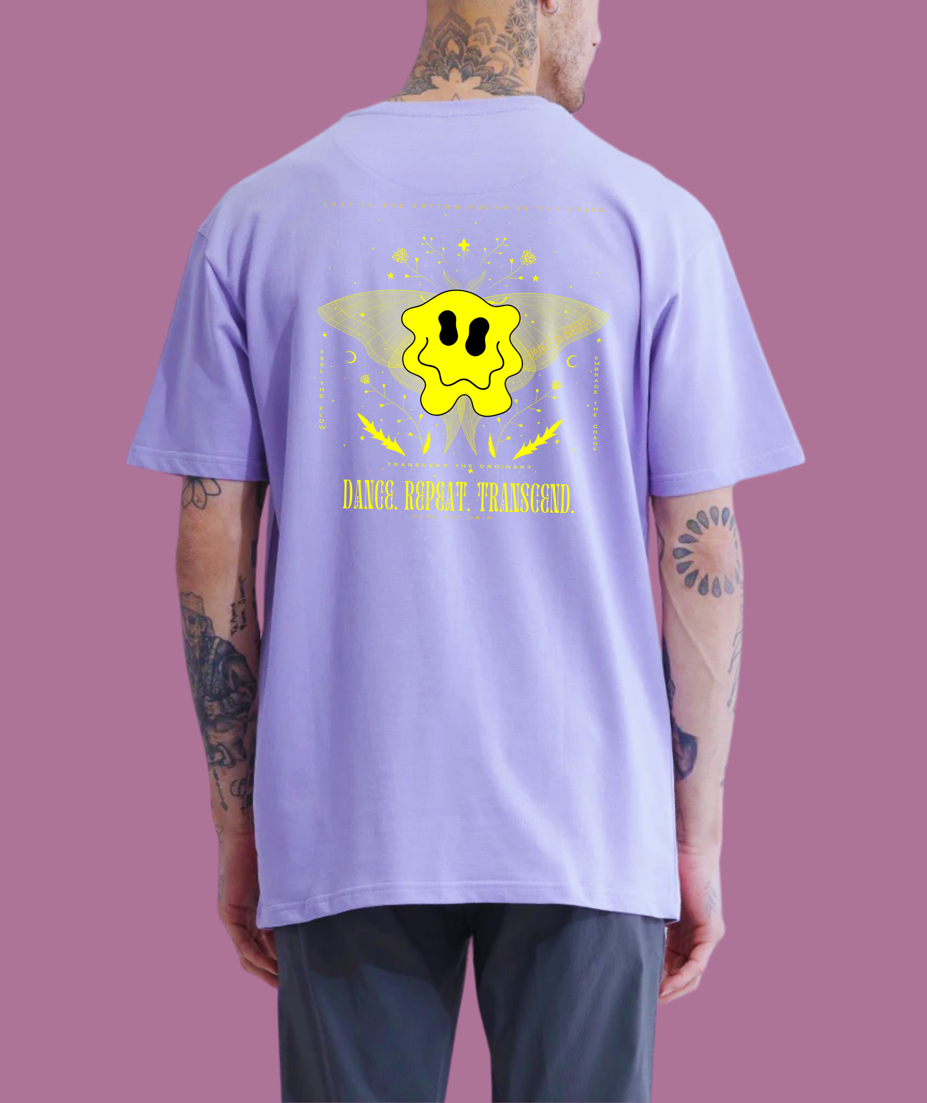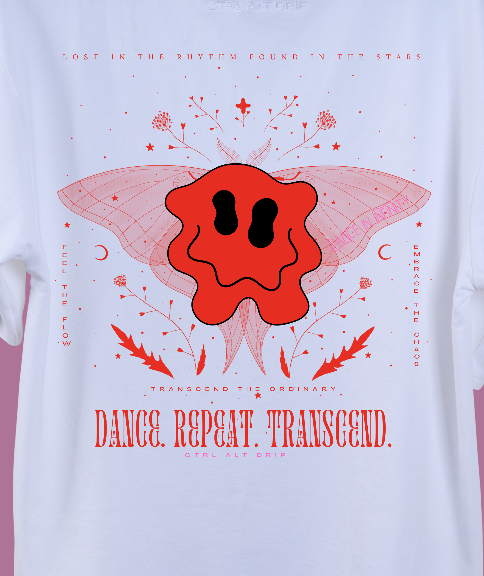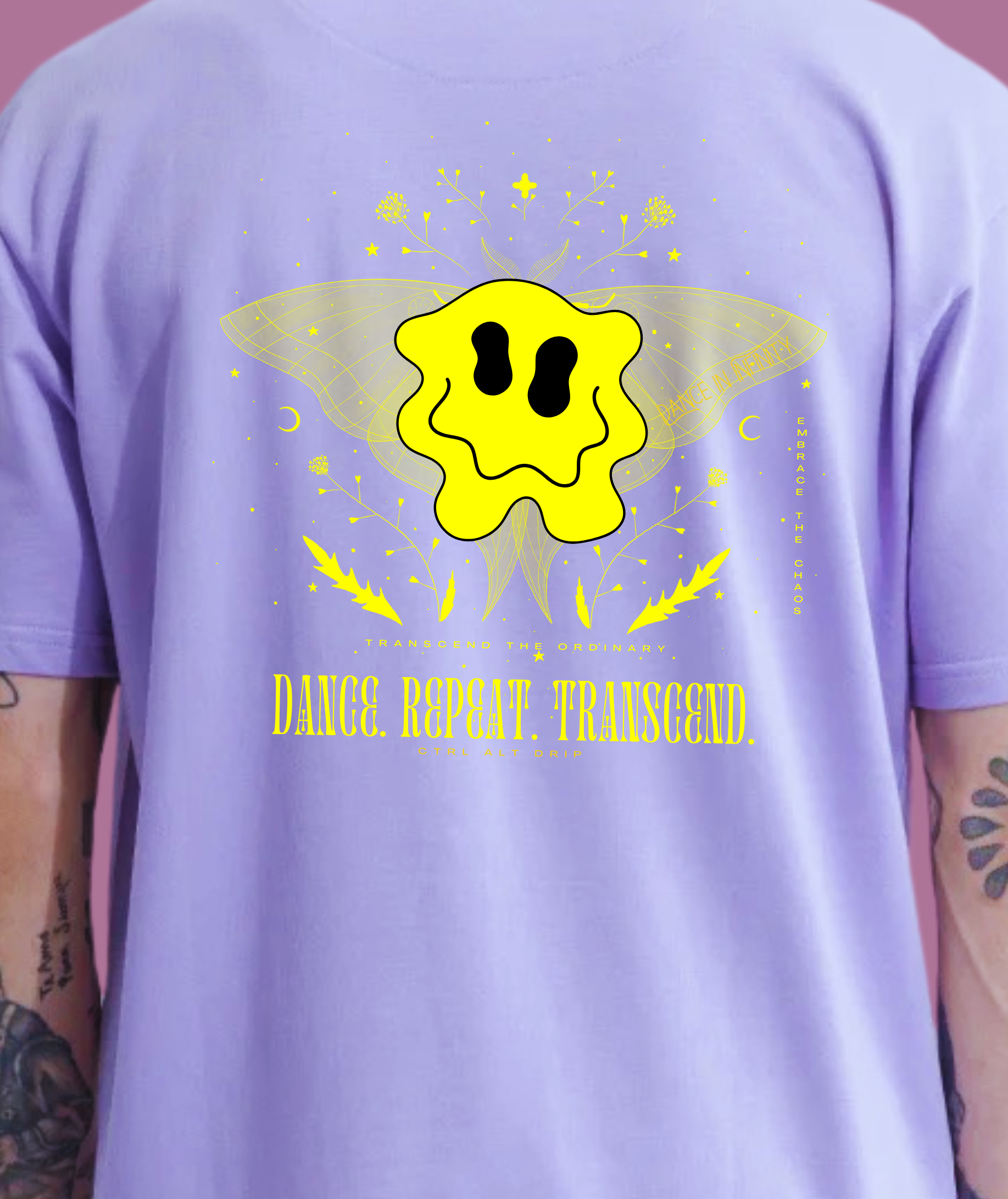 The central design, inspired by trippy visuals and altered states of perception, features a melting smiley face—a symbol of unfiltered joy and boundless energy. Behind it, a mystical moth with intricate details spreads its wings, embodying transformation, movement, and the ethereal pull of music and euphoria. Around it, delicate floral elements, cosmic symbols, and abstract strokes weave together, mirroring the dreamy, hypnotic state of an endless night.