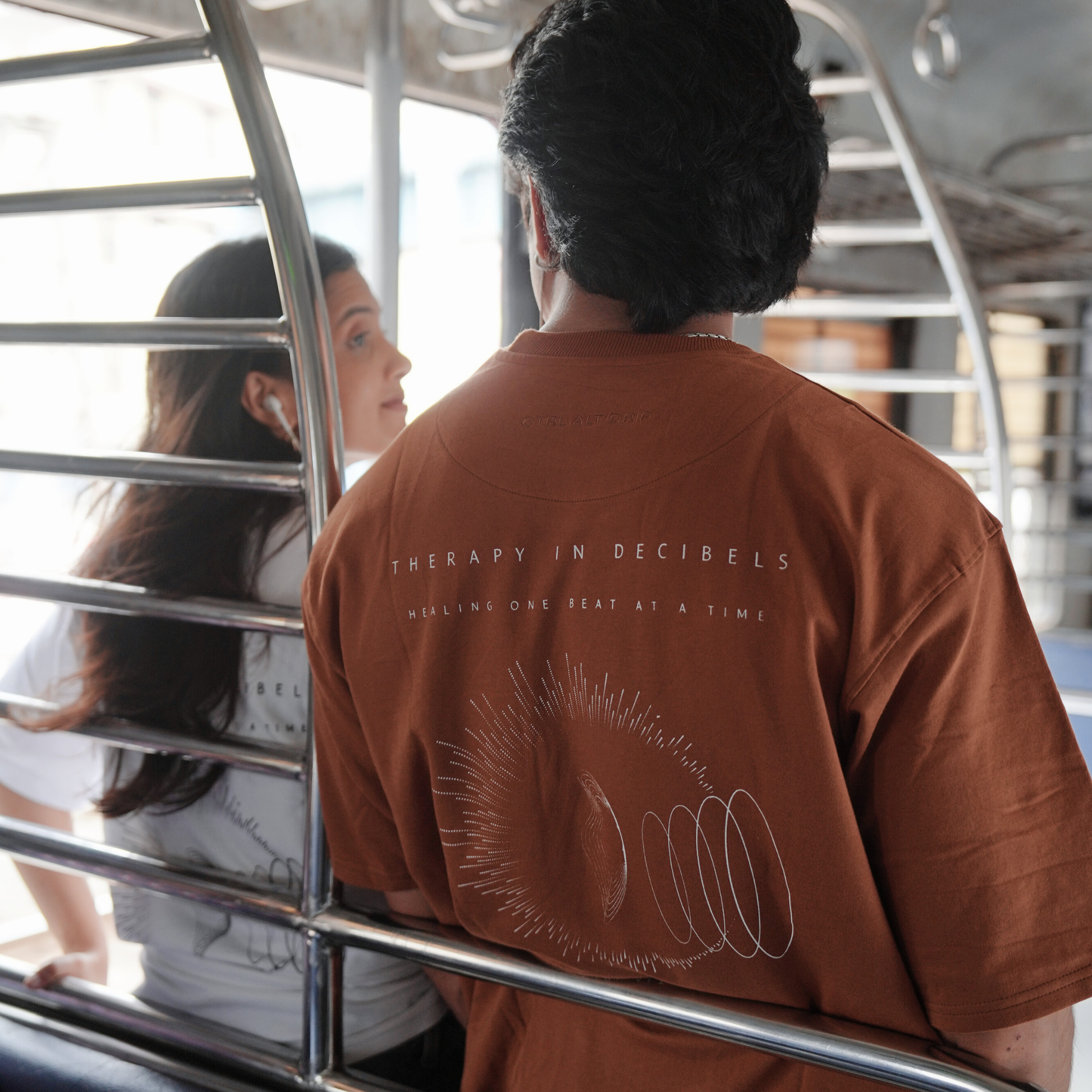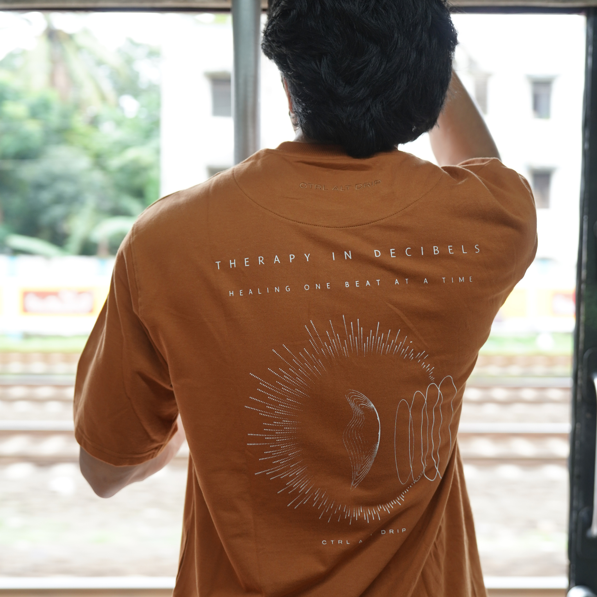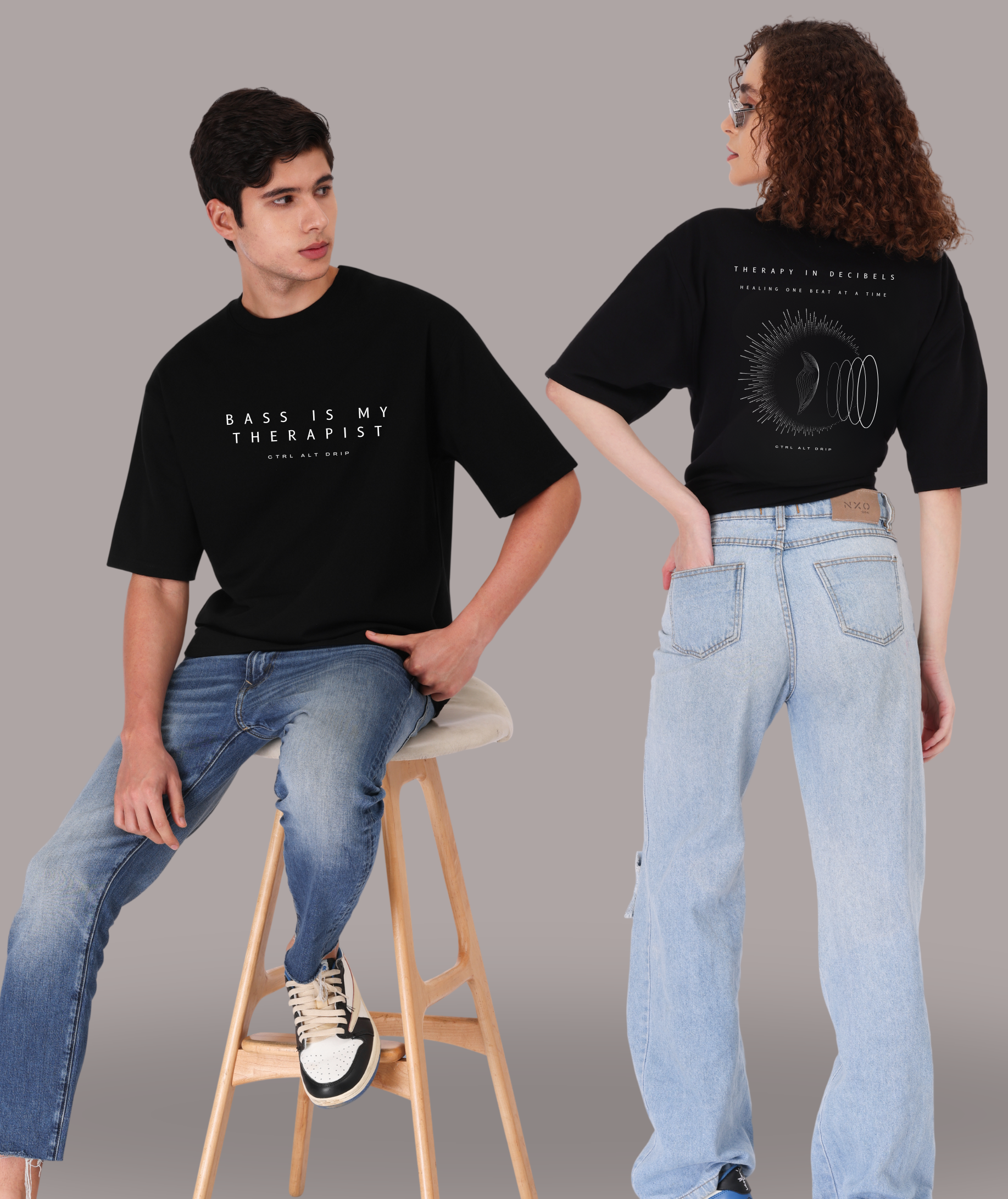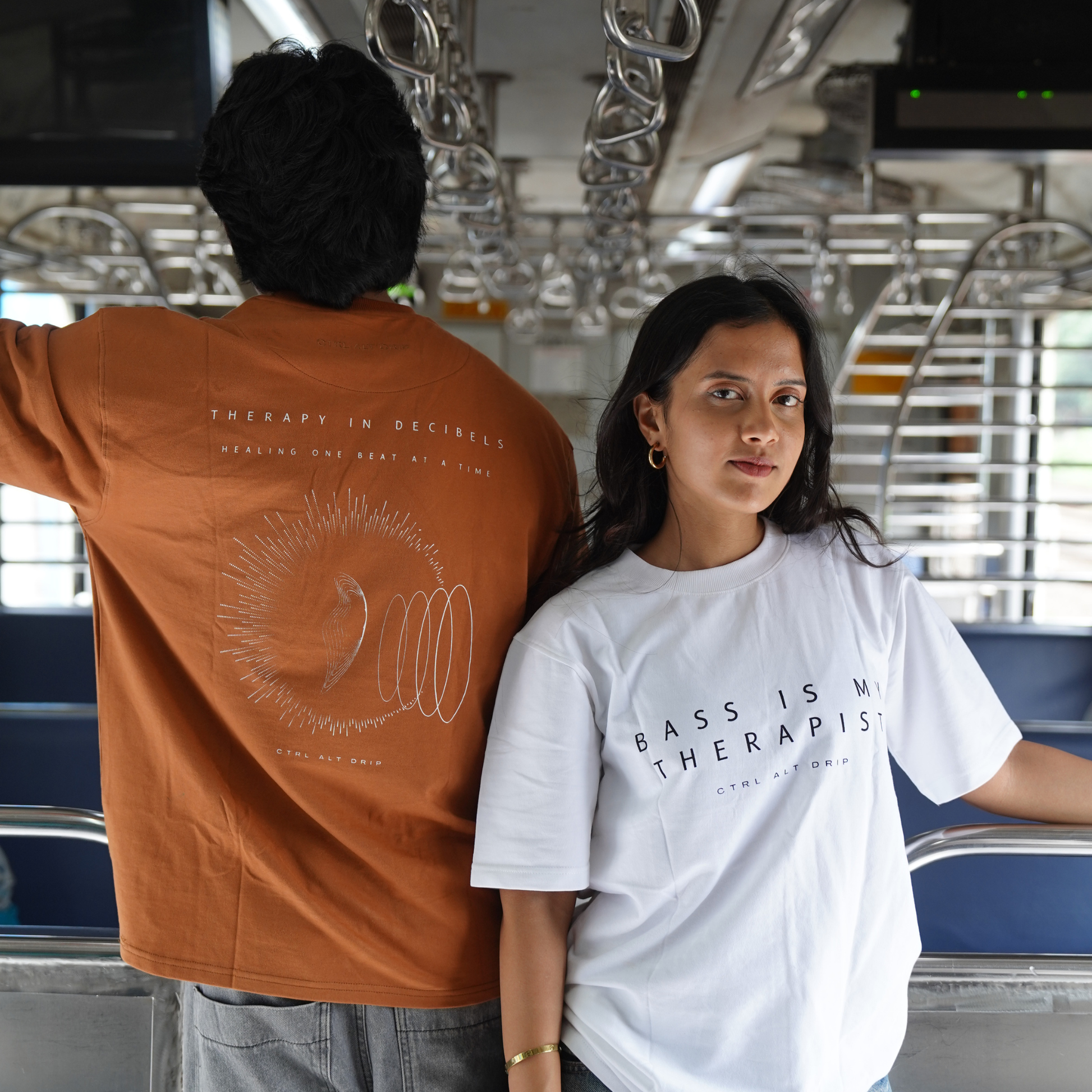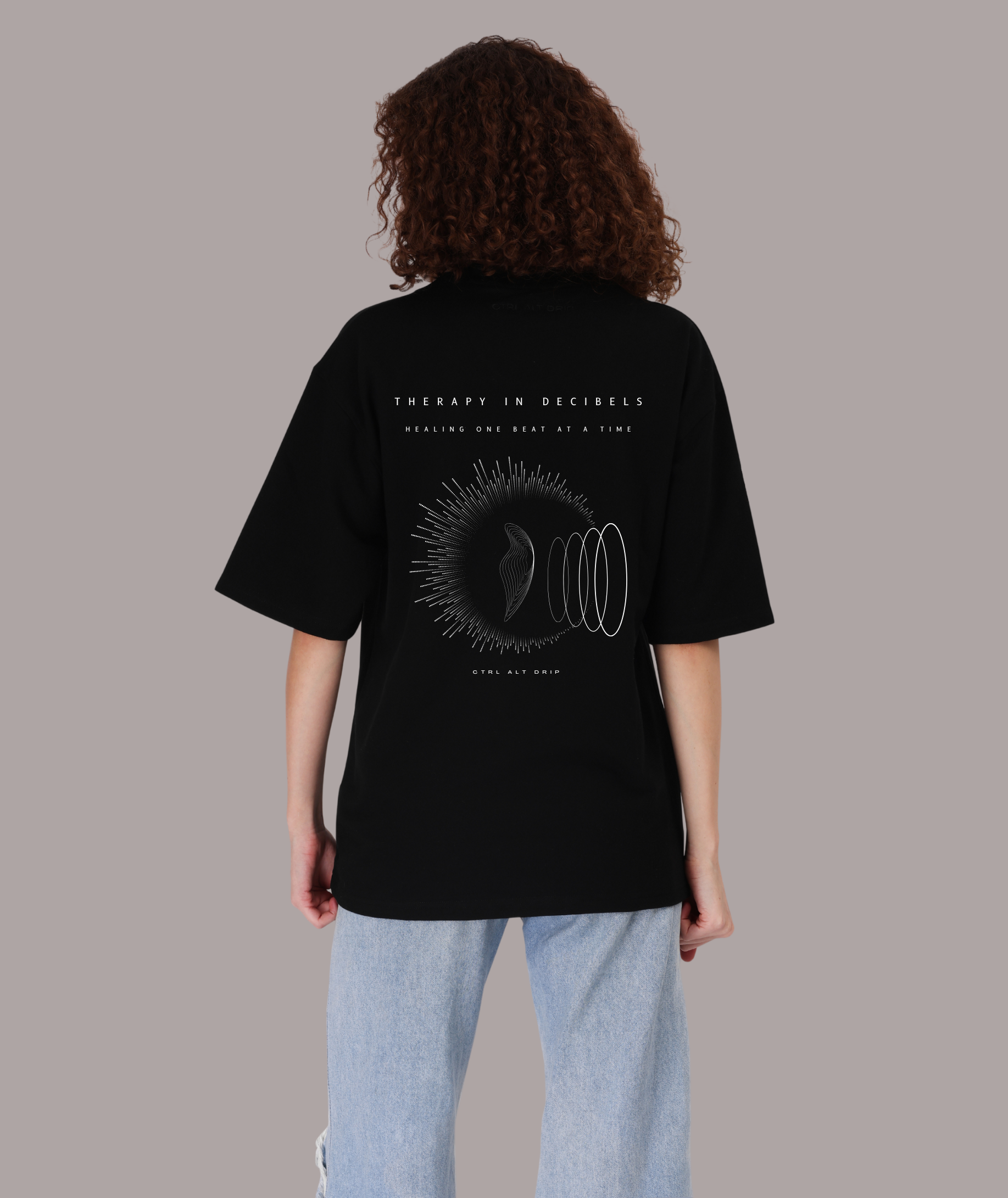 At the top, the words “THERAPY IN DECIBELS” set the tone—because music is more than sound; it’s therapy. Below it, the phrase “HEALING ONE BEAT AT A TIME” reminds us that bass isn’t just something you hear—it’s something you feel, something that resonates deep within.