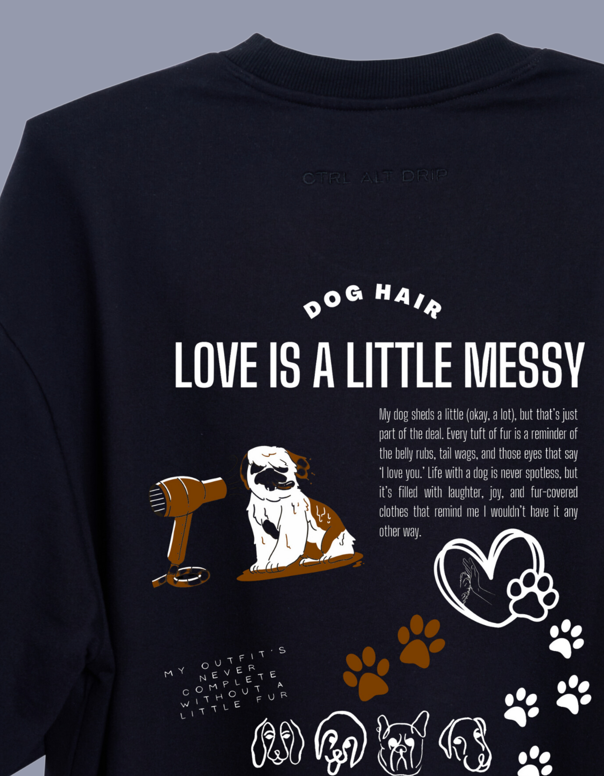 - Paw prints that trail up the design add an extra touch, showing how dogs leave their marks on our clothes — and our hearts.